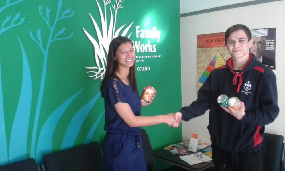 Pictured is Grayson Orr (Student Executive) handing over some of the cans to Preeti Aryal from Presbyterian Support.